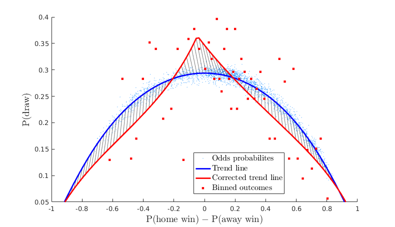 Let $p_H$, $p_D$, and $p_A$ be the probabilities for home win, draw, and away win derived from the odds as $\frac{1}{b}$. In the figure above we have plotted $p_H-p_A$ (home team advantage) versus $p_D$ (probability for draw) for the games in Premier Leauge over the last 10 years. The blue dots represent the odds-probabilities, and the blue line is the corresponding trend line. (Think of this as $\frac{1}{b}$). The red line is a trend line for a multinomial logistic regression of the game outcomes. (Think of this line as the true probability $p$). Even though these lines are close to each other they are not identical which implies that $\frac{1}{b}$ is not an perfect estimation of $p$. However, we can measure the difference between the red and blue line for every point which we call $\Delta_b$. If we now form $p^*$ as $$p^* = \frac{1}{b} + \Delta_b$$ we will hopefully end up with an even better $p^*$. While the model we use on this page is slightly more complicated than this, it is this concept that lies behind it.