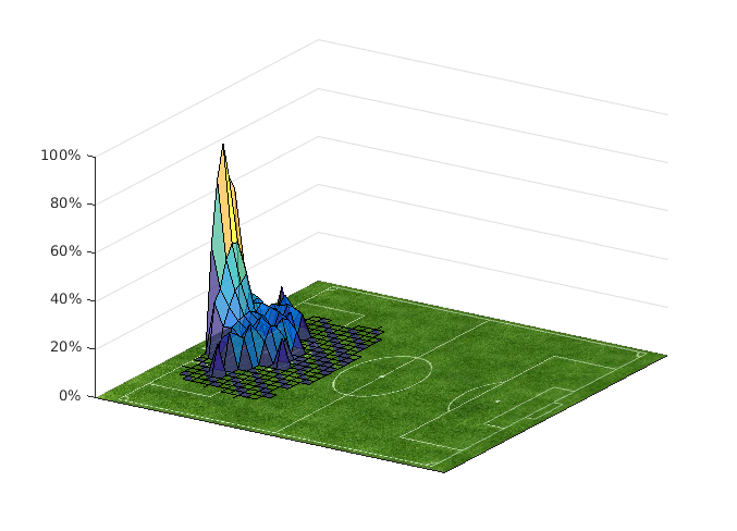 So how do we estimate the expected number of goals? Imagine that the football pitch is divided into a large amount of boxes. The amount of goal attempts from each box is then recorded for a very large set of games played. The number of shots that turned into actual goals can then be divided by the number of shots on the goal for every box, and a probability of scoring a goal from that box can be estimated. This would look something like this.