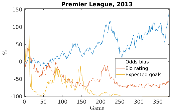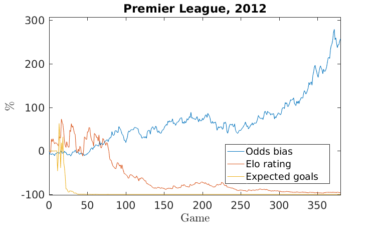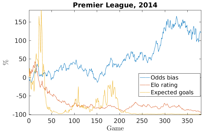 We can see that our expected goal model is rather bad an loses all the money within a few weeks. The Elo model does earn money this year but other years it does not and the fluctuations are large compared to the odds bias model. The model we consider the best is therefore the Odds bias model, this because it has small fluctuations and has been earning money since 2013, this is the model that we are using on this web page.